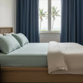 Curate a serene Diwali bedroom with the Diwali Bedroom Bundle Queen - Ocean Calm, featuring a flat sheet, pillow covers, duvet cover, and curtains. Blue Surf, natural, and indigo hues combine for layered comfort and timeless festive style.
