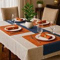 Set a soulful table with the Coastal Earth bundle, including 1 Tablecloth (Square), 1 Runner (Medium), 4 Placemats, and 4 Napkins. Natural, indigo, and rust linens combine for layered texture, quiet warmth, and effortless festive elegance.