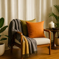 Bring earthy calm into your home this Diwali with natural beige linen curtains, paired with rich green moss and rust accents. A reversible gold-black throw adds a glowing festive edge.