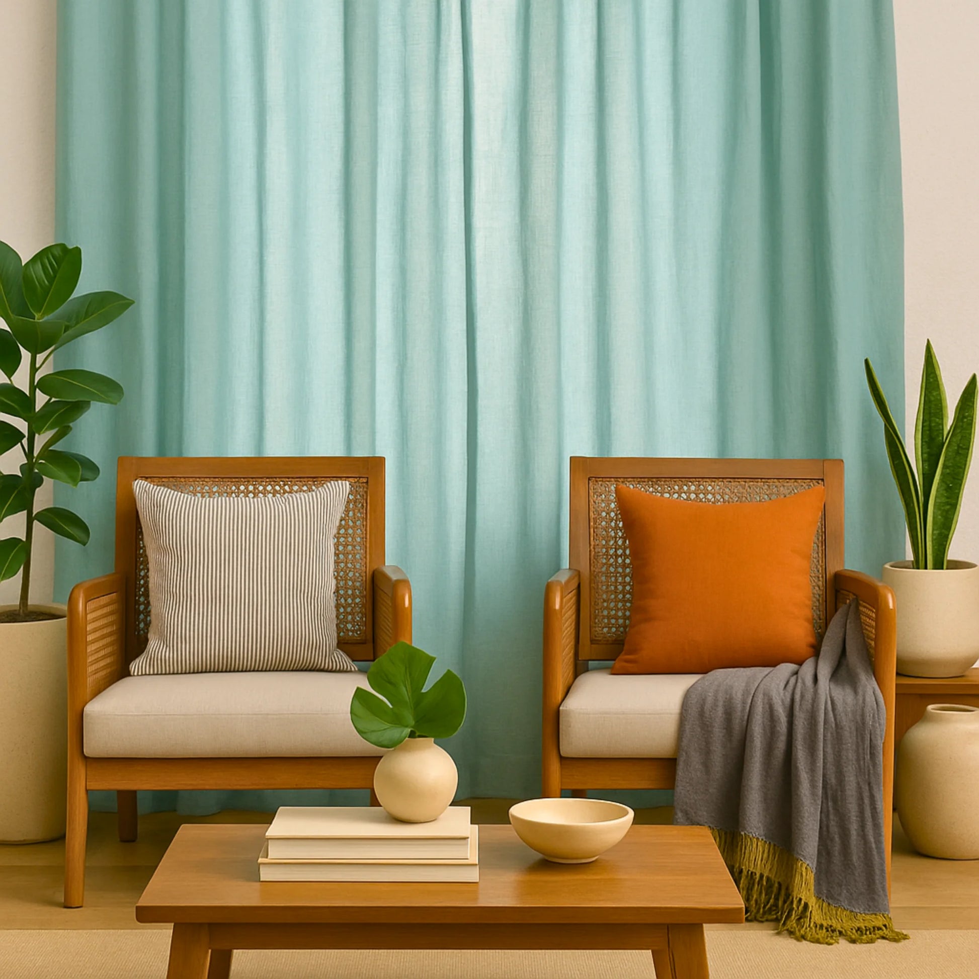 Celebrate Diwali with a living room set that blends calm blues, earthy rust, and soft monochromes. The linen drape, striped cushions, and reversible throw create a festive yet timeless mood.