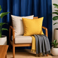 This Diwali, elevate your living room with the richness of indigo curtains, softened by natural linen and glowing with golden warmth. A reversible gold-black throw ties the look together with quiet luxury.